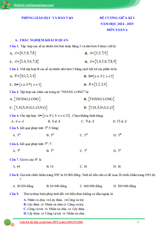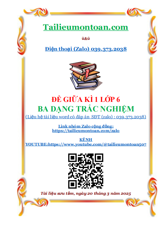 Đề giữa kì 1 môn toán lớp 6 năm 2025