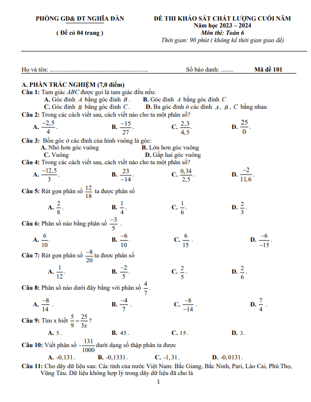 Đề khảo sát Toán 6 cuối năm 2023 – 2024 phòn...