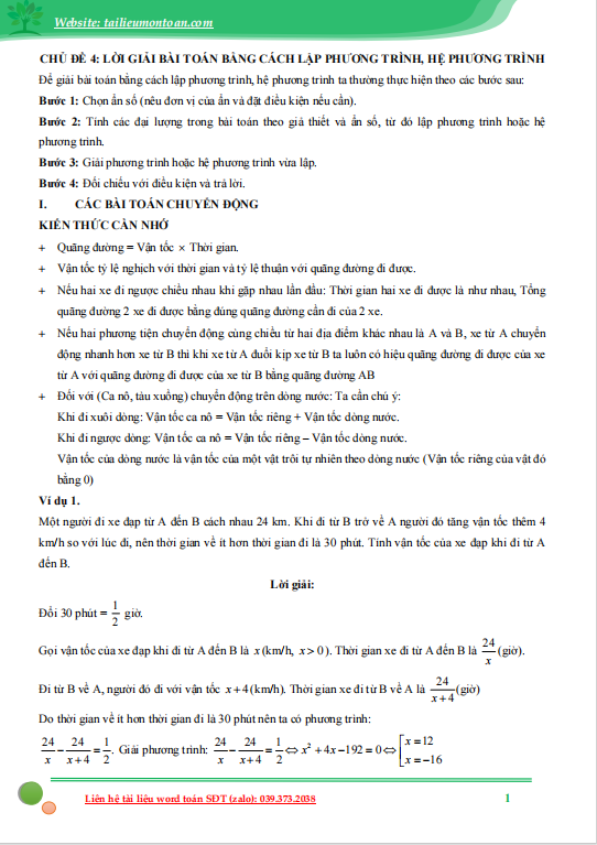 Chủ đề 4: Giải bài toán bằng lập phương trình, hệ phương trình